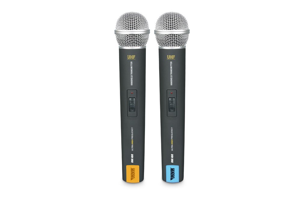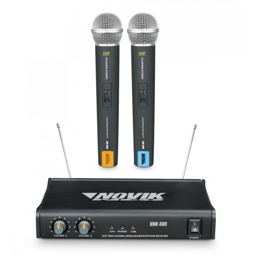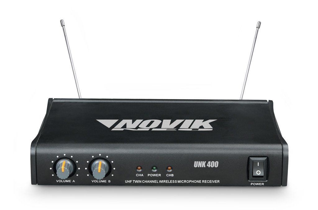 Microfone sem fio da Novik UHF, funciona em frequências altas para evitar interferencias emitidas a partir de aparelhos de CD, VCD e LD por exemplo que irradiam muitas harmonicas.