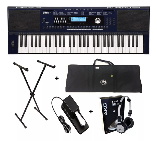 E-X30 Teclado Arranjador com Capa, Estante em X, Pedal de Sustain, Fonte e Fone AKG